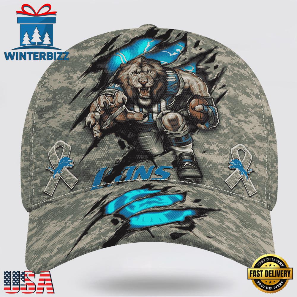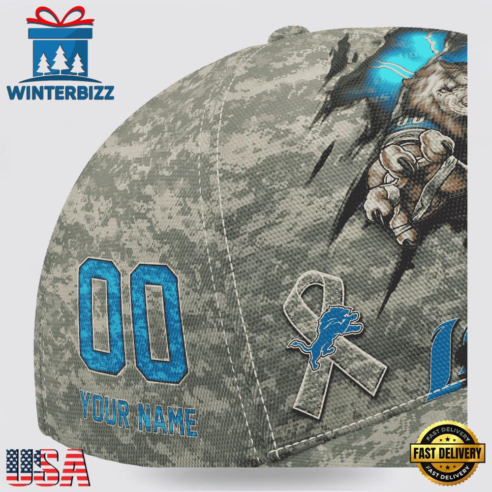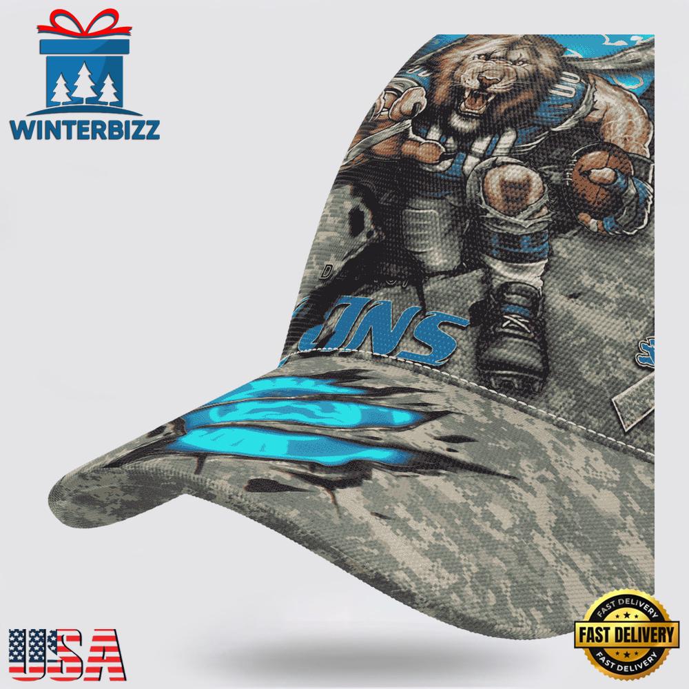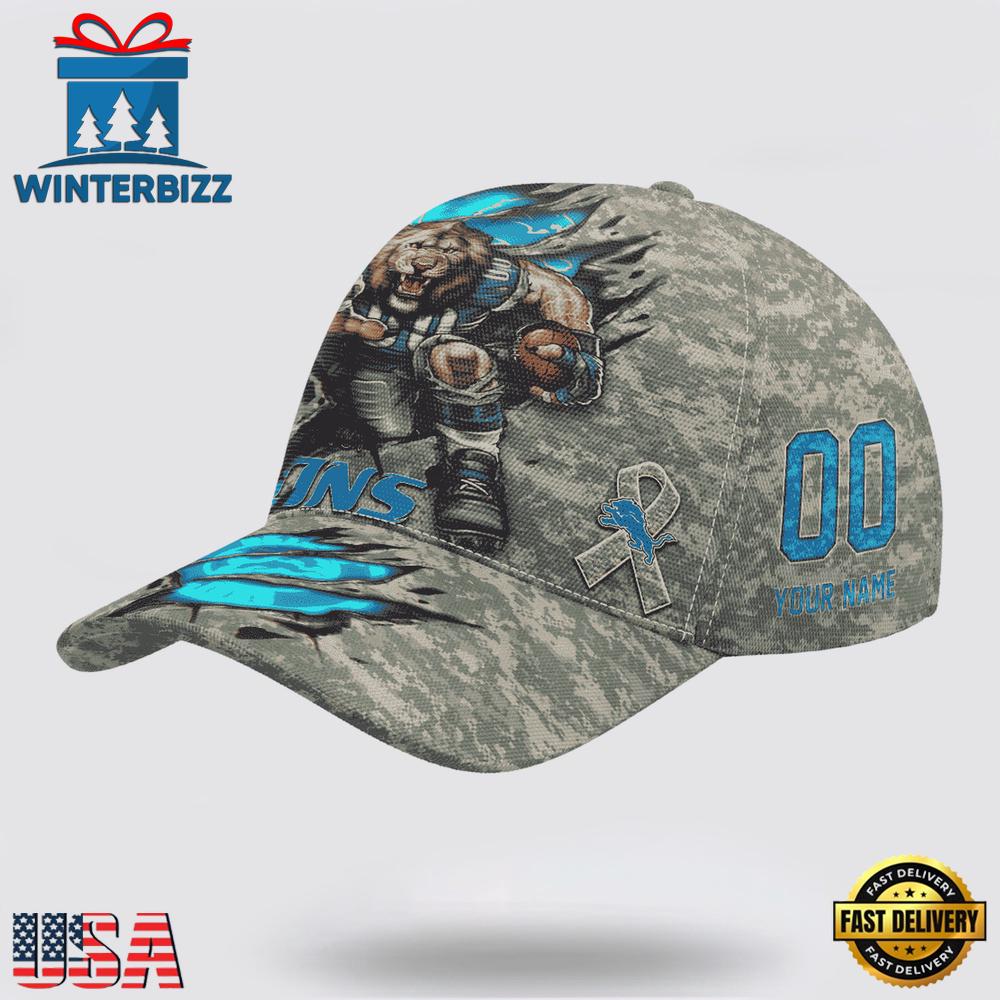 Custom Name And Number NFL Lions Camo Mascot New Design Classic Baseball Cap