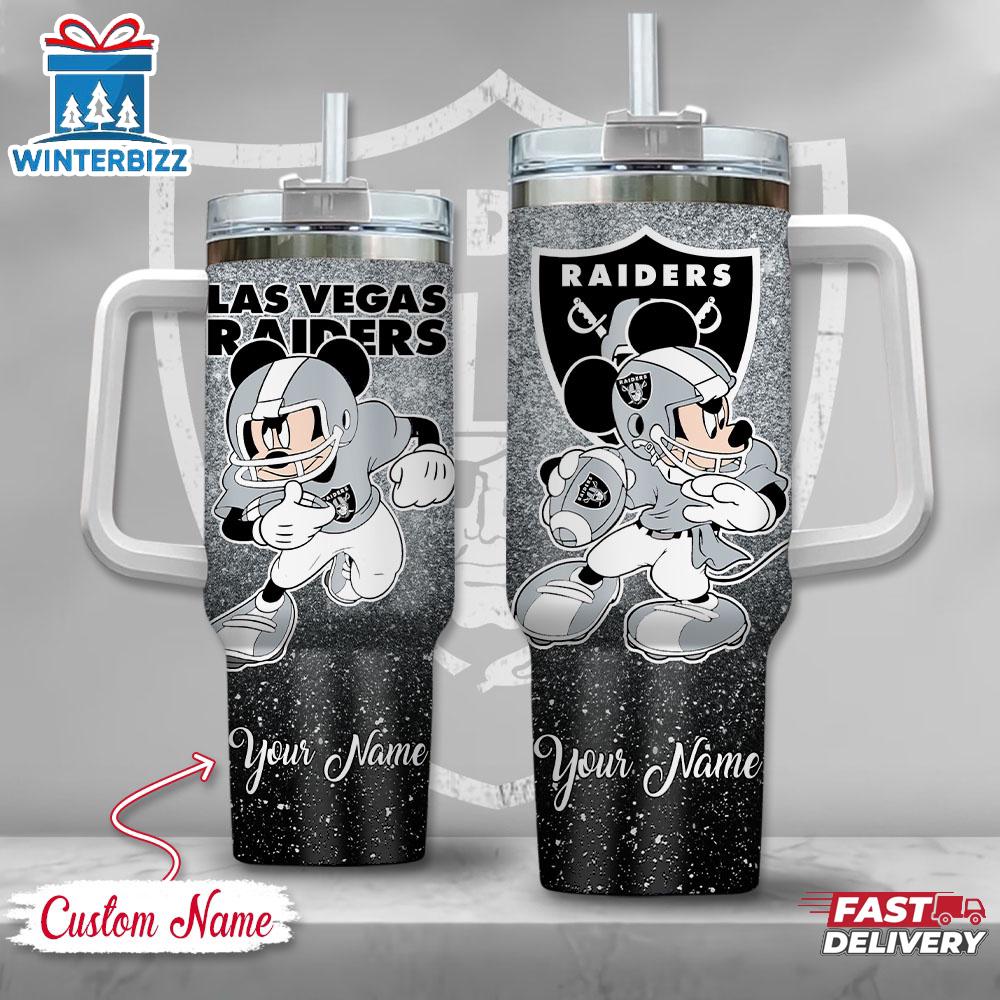 Photos Of Custom Name Las Vegas Raiders NFL Mickey Mouse Stainless Steel Tumbler 40Oz With Handle