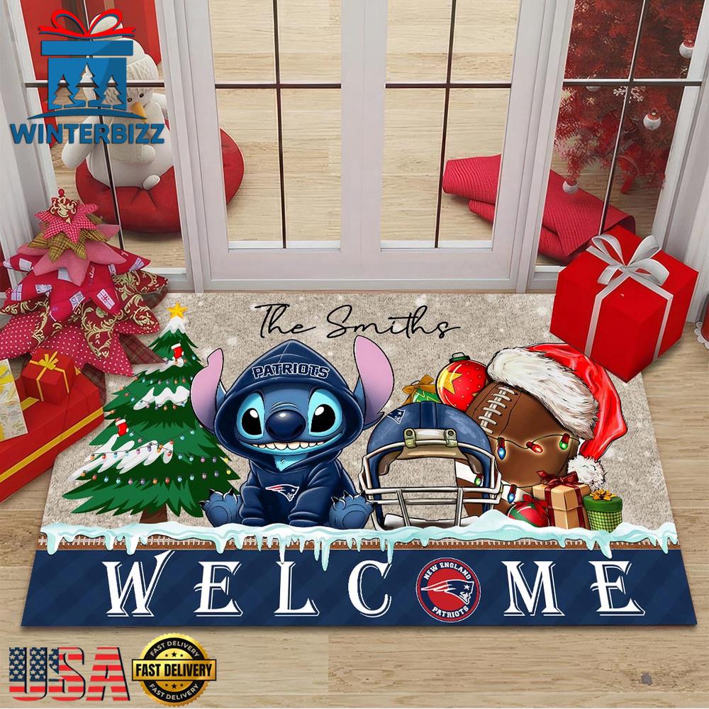Custom Name NFL New England Patriots Cute Stitch Welcome Christmas Doormat , Doormat Outdoor