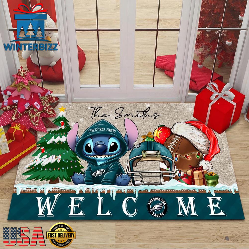 Custom Name NFL Philadelphia Eagles Cute Stitch Welcome Christmas Doormat , Doormat Outdoor