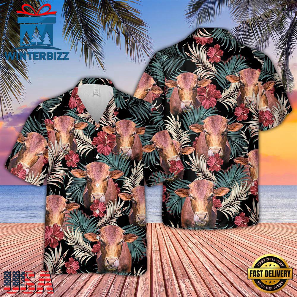 Photos Of Farm Hawaiian Shirt, Beefmaster Dark Red Flowers Pattern Hawaiian Shirt, Funny Hawaiian Shirt