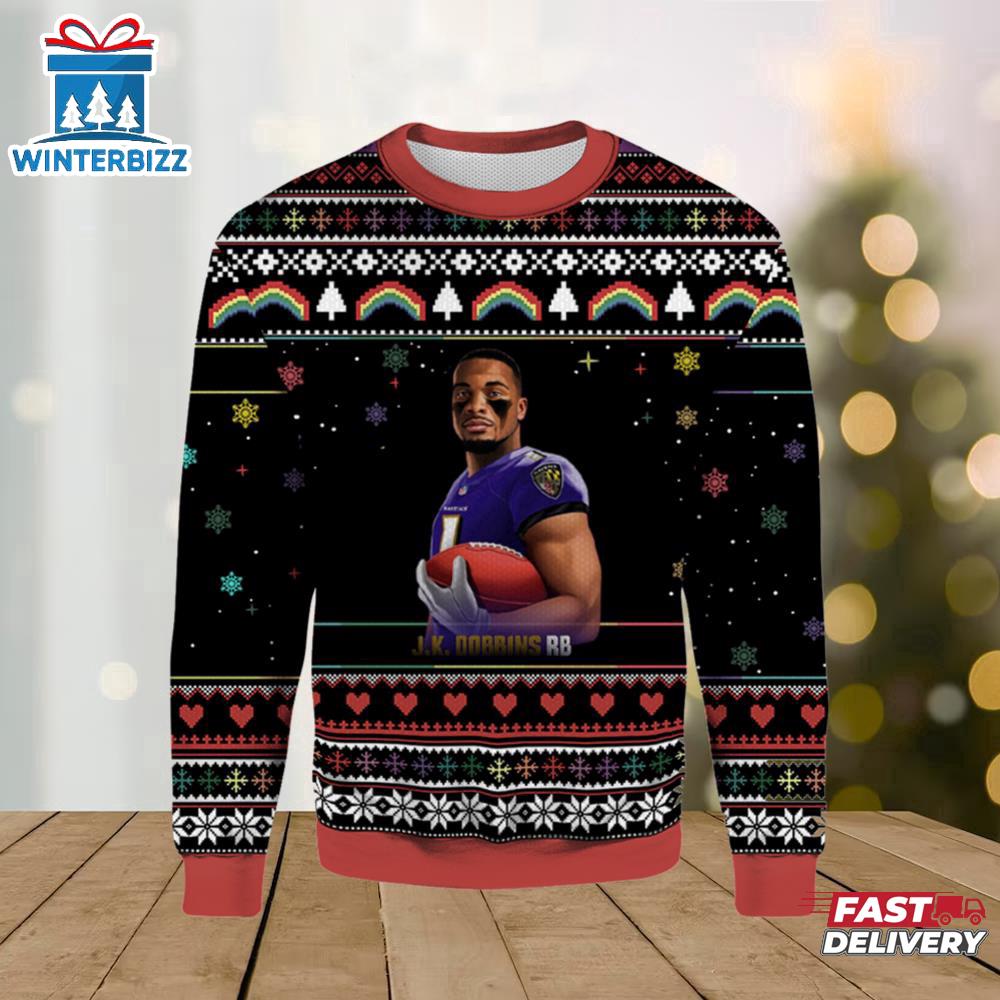 J.K. Dobbins RB Baltimore Ravens Ugly Sweater is a Christmas sweater with funny, humorous, and quirky patterns. It will be a meaningful gift for you to show your love and care for your loved ones.