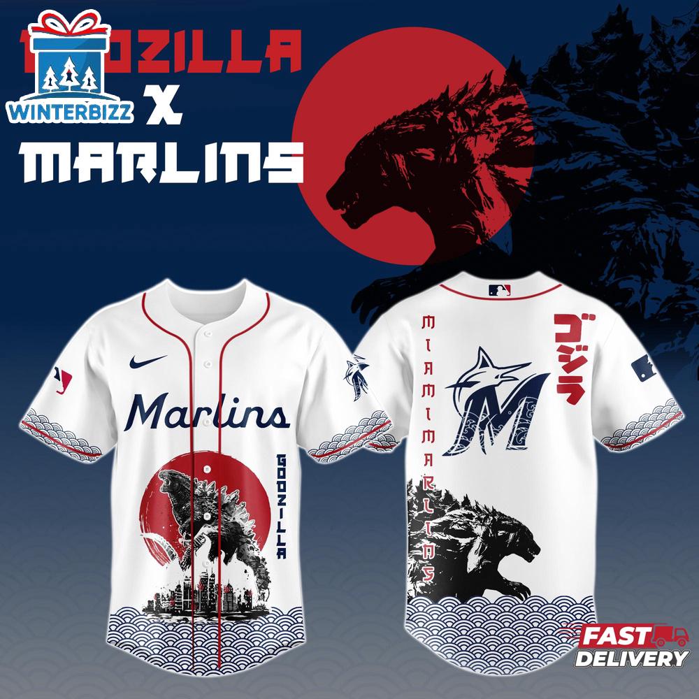 Photos Of Miami Marlins MLB x Godzilla Baseball Jersey Shirt For Fans