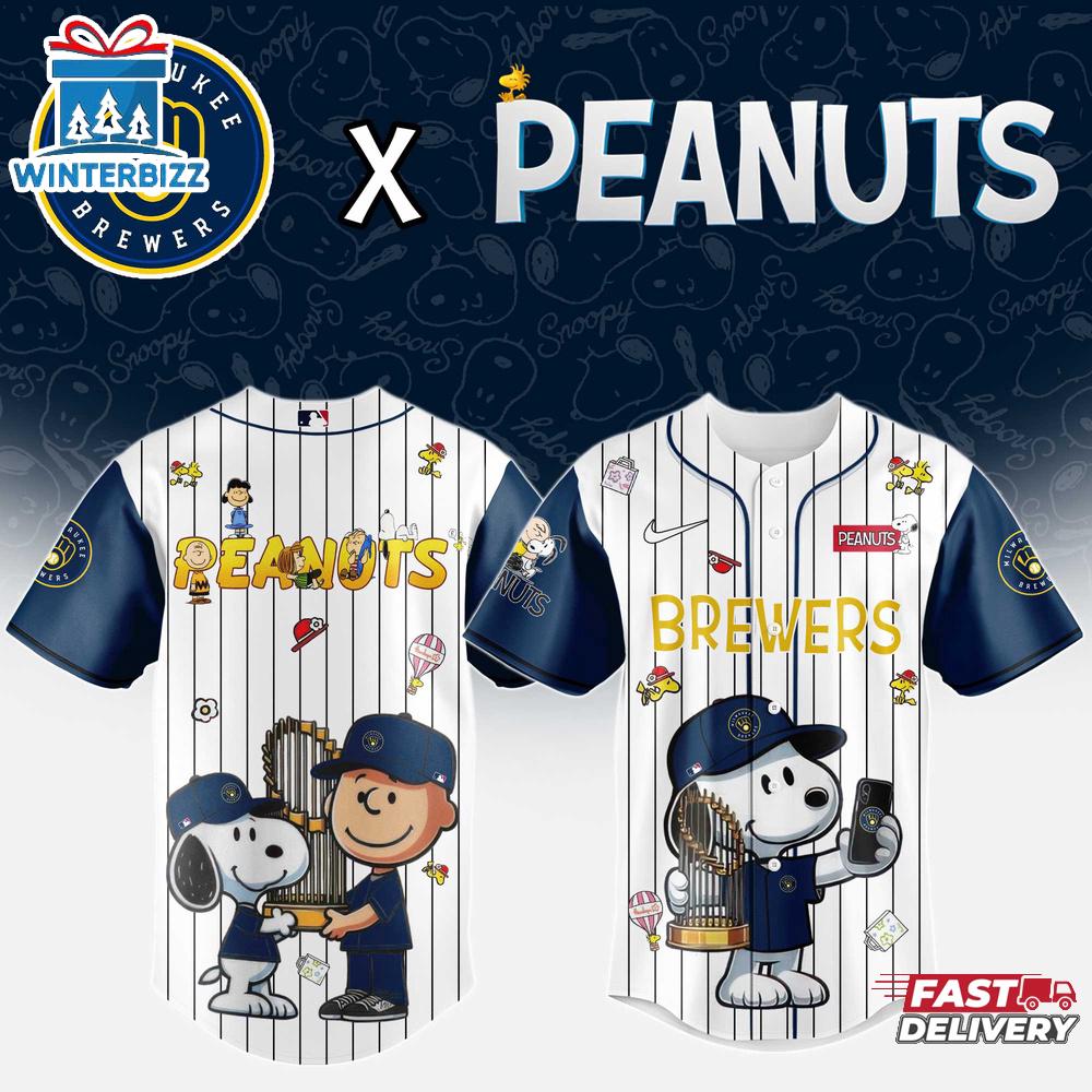 Photos Of Milwaukee Brewers MLB x Peanuts Baseball Jersey Shirt