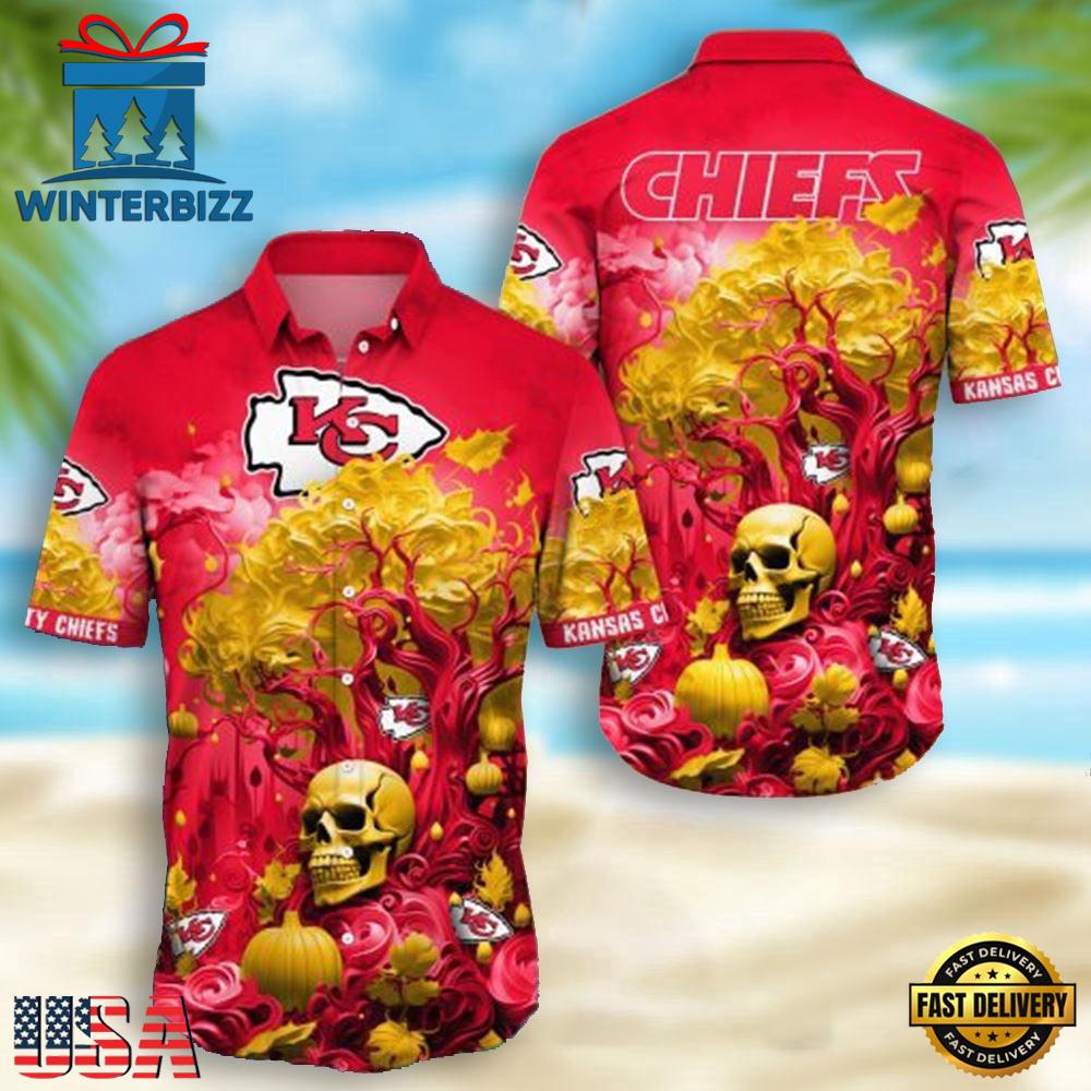 NFL Kansas City Chiefs Skull Pumpkin Halloween Hawaiian Shirt , Hawaiian Shirt For Mens