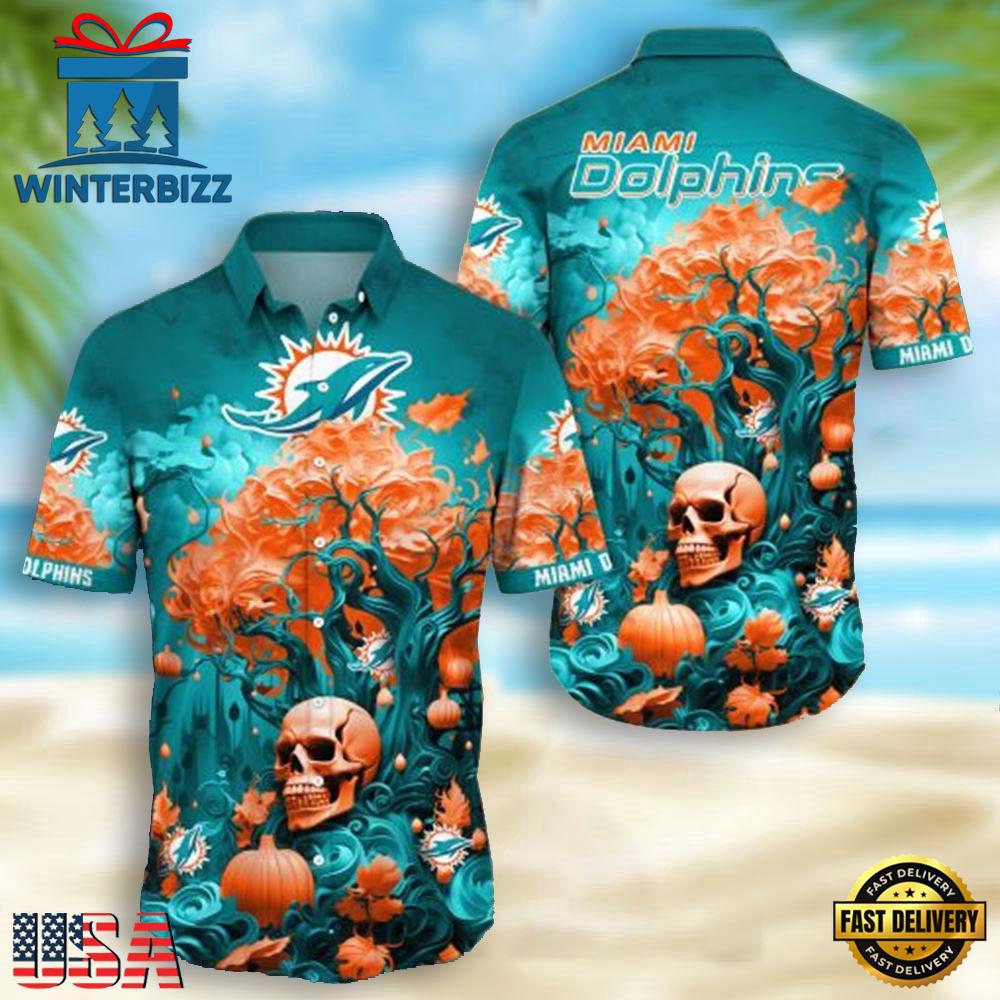 NFL Miami Dolphins Skull Pumpkin Halloween Hawaiian Shirt , Hawaiian Shirt For Mens