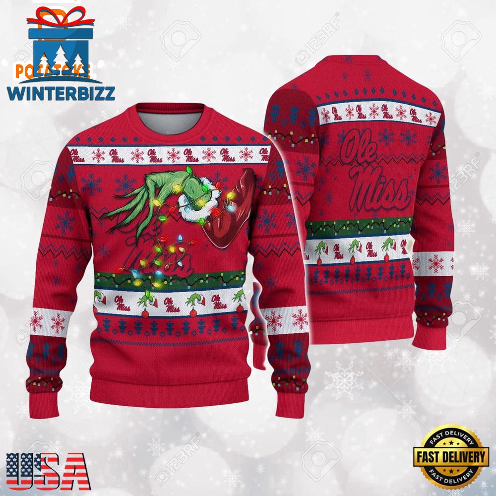 Photos Of Ole Miss Rebels Merry Christmas Grinch Hand NCAA Ugly Christmas Sweater , NCAA Christmas Sweaters