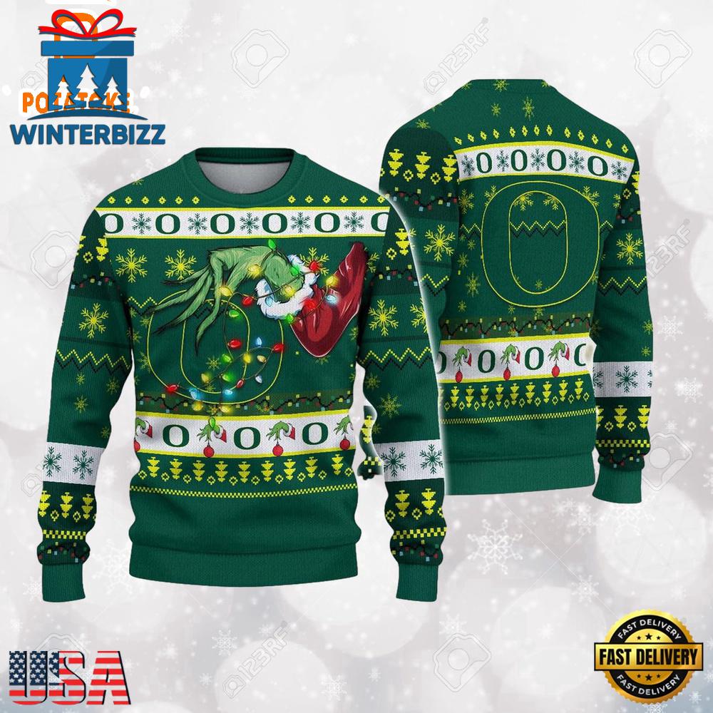 Photos Of Oregon Ducks Merry Christmas Grinch Hand NCAA Ugly Christmas Sweater , NCAA Christmas Sweaters