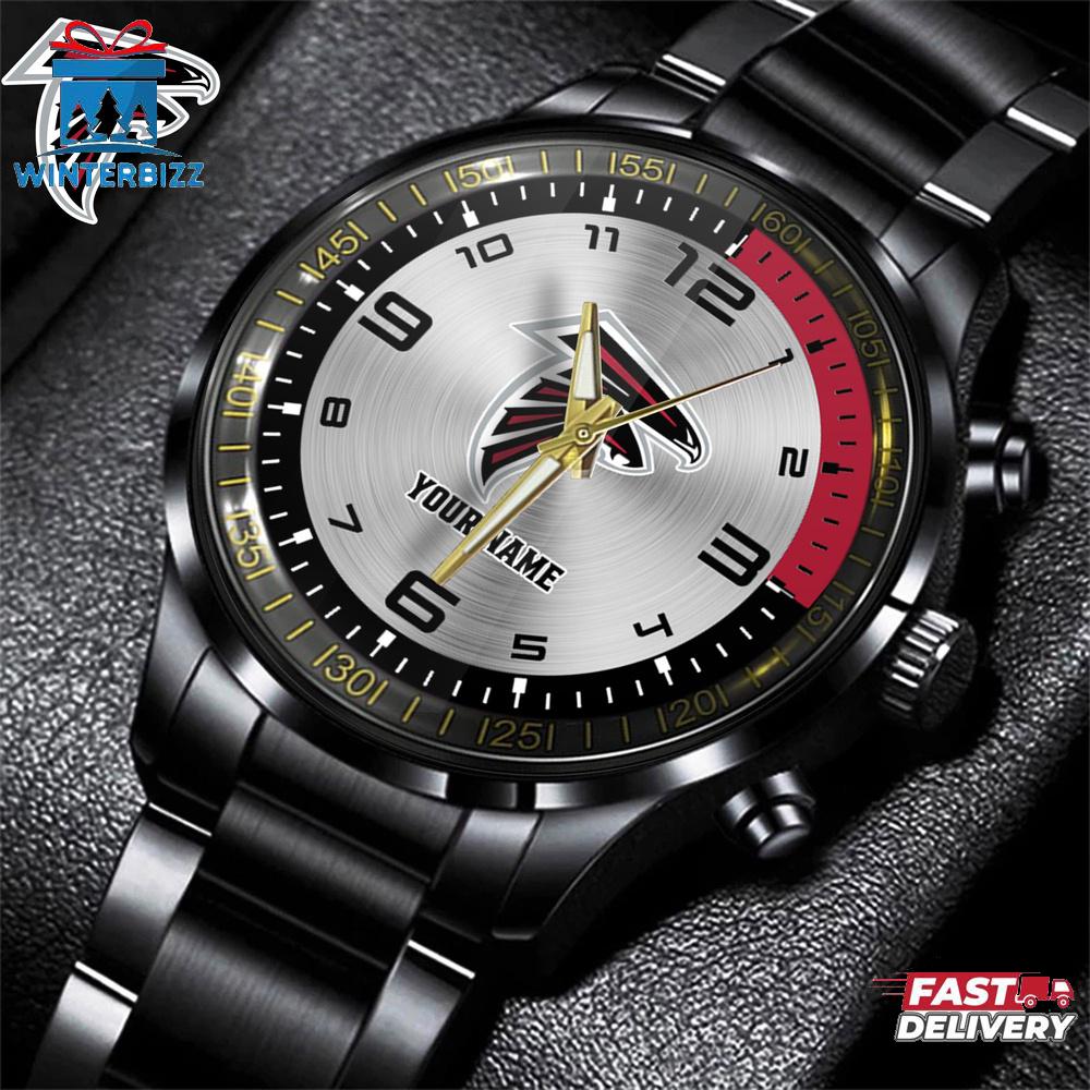 Product details: Personalized Name Football Atlanta Falcons NFL Black Stainless Steel Watch Gift For Fans