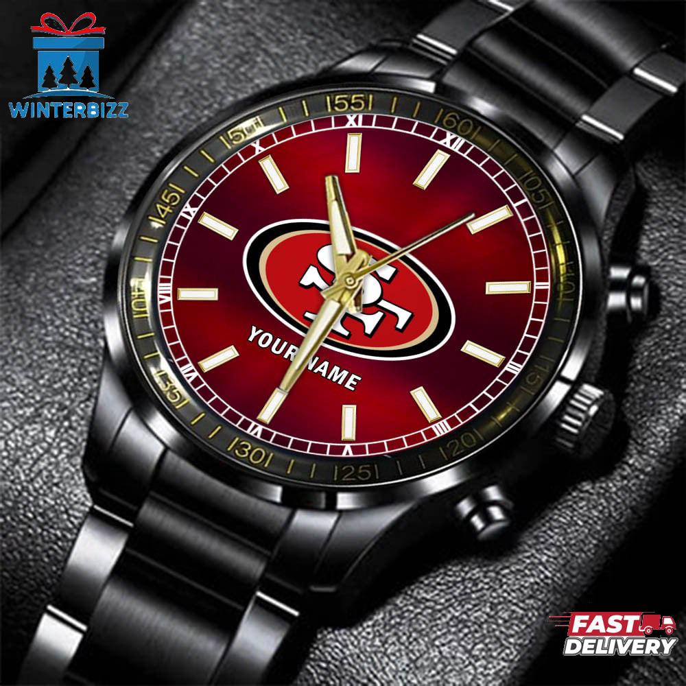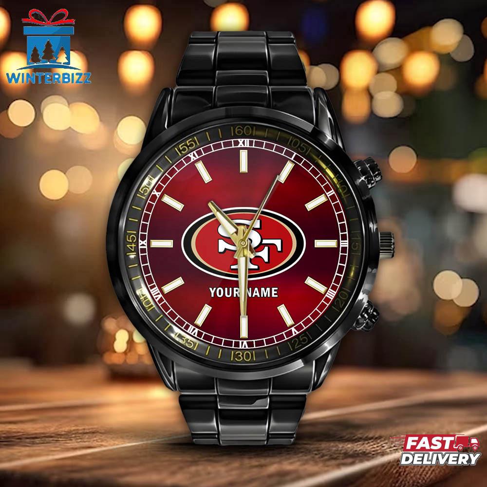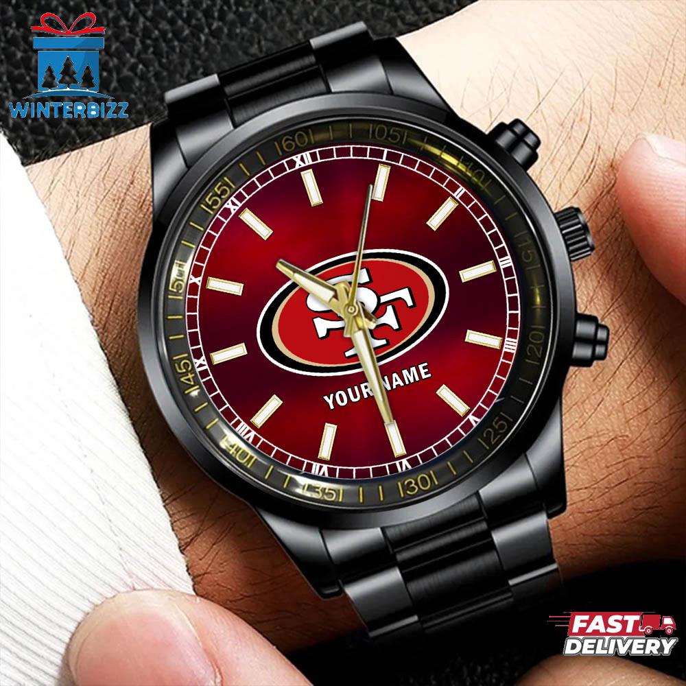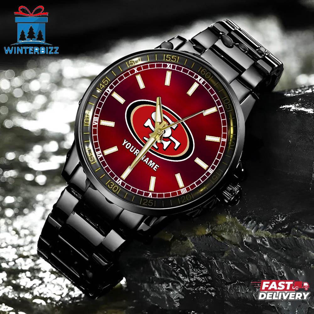Product details: Personalized Name Football San Francisco 49ers NFL Black Stainless Steel Watch Gifts For Fans