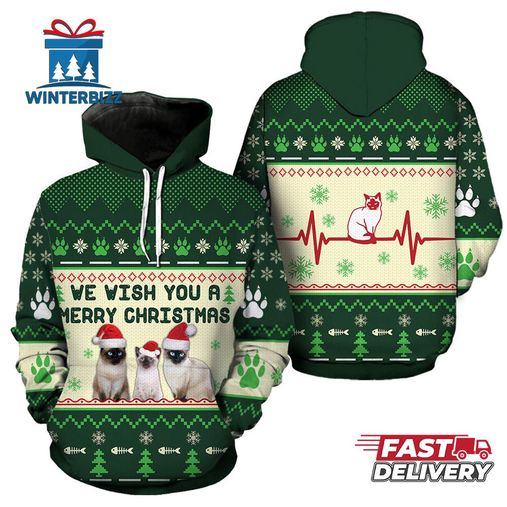 Siamese Cat We Wish You A Merry Christmas Hoodie All Over Print The 3D Shirt is a fashion statement that goes beyond the ordinary. Using advanced printing technology, it brings designs to life with depth and vividness. Crafted from high-quality materials, it offers comfort and durability. The three-dimensional graphics create a captivating effect that’s perfect for casual wear or making a bold statement. Whether you’re expressing your fandom or showcasing your unique taste, the 3D Shirt is a wearable work of art that sets you apart from the crowd.