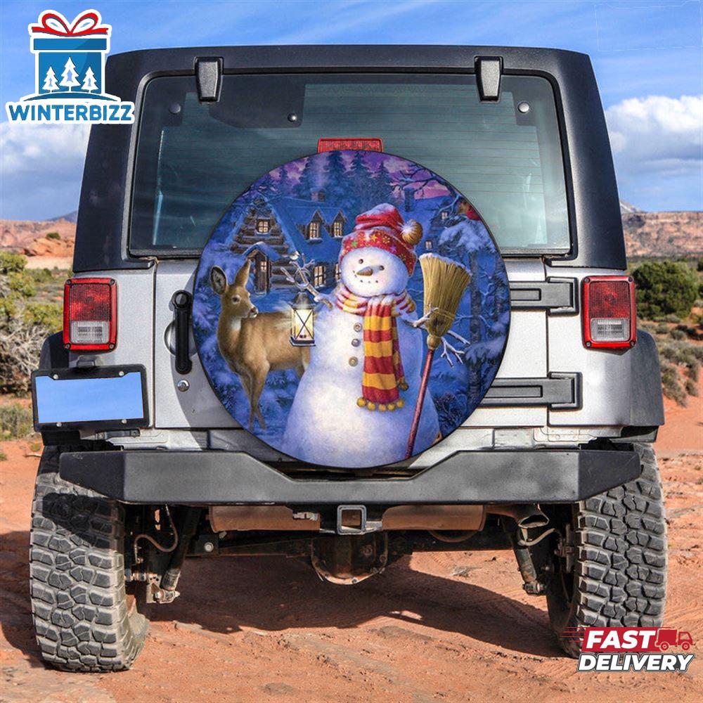 Snowman And Deer Car Spare Tire Cover Decoration The Spare Tire Cover is a functional and stylish accessory for any vehicle. Constructed from durable materials, it offers essential protection for your spare tire against sun, rain, and dust. Its tailored fit and elasticized edges ensure it remains securely in place, even at high speeds.