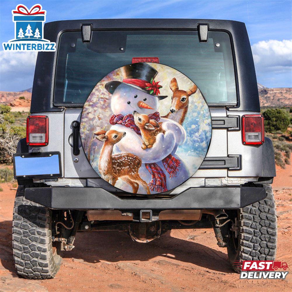 Snowman And Deer Lover Car Spare Tire Cover Decoration The Spare Tire Cover is a functional and stylish accessory for any vehicle. Constructed from durable materials, it offers essential protection for your spare tire against sun, rain, and dust. Its tailored fit and elasticized edges ensure it remains securely in place, even at high speeds.